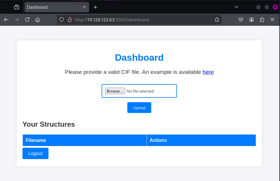 We are allowed to freely register an account with no authentication required which brings us to an upload page which also presents us with an example CIF document to test it with.